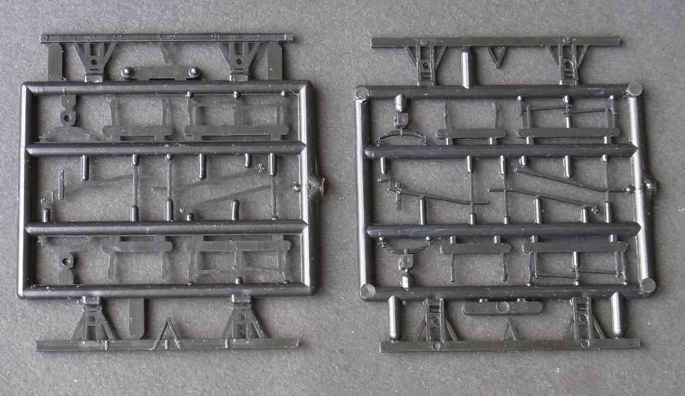 10′ 6″ wheel base 19’chassis wood & steel. 2 x 19′ solebars with 10′ 6″ wheel base W irons with tiebar, 2 x 3 leaf spring, flat axleboxes, 2 and 4 shoe Morton and 8 shoe Clasp brakes (per sprue , 4 shoes and one Anita tension lock coupling mount), 3 long brake levers, one with a reversing cam, one with a lifting link. There are 2 identical sprues to make one complete steel underframe or one wood, but no headstocks.
