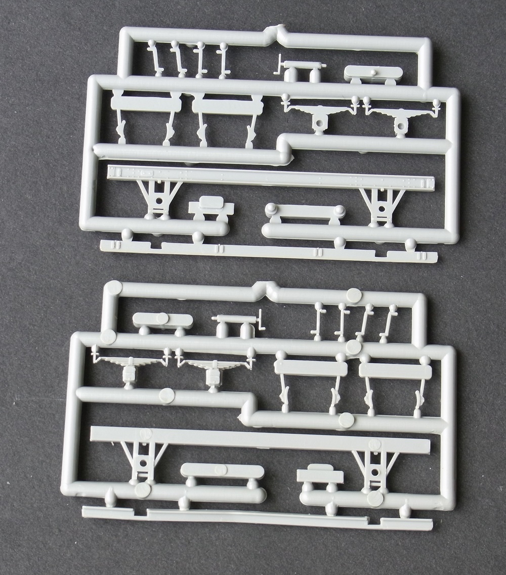 16′ wheel base 24′ GWR Toad Brake van under frame. 2 sprues, each with a solebar and W irons, 2 x 5 leaf spring (J hanger) with split oil axleboxes, clasp brake shoes, one Footboard and 4 separate support brackets, a screw brake column and an Anita tension lock and a B&B/DG coupling mount. No headstocks.