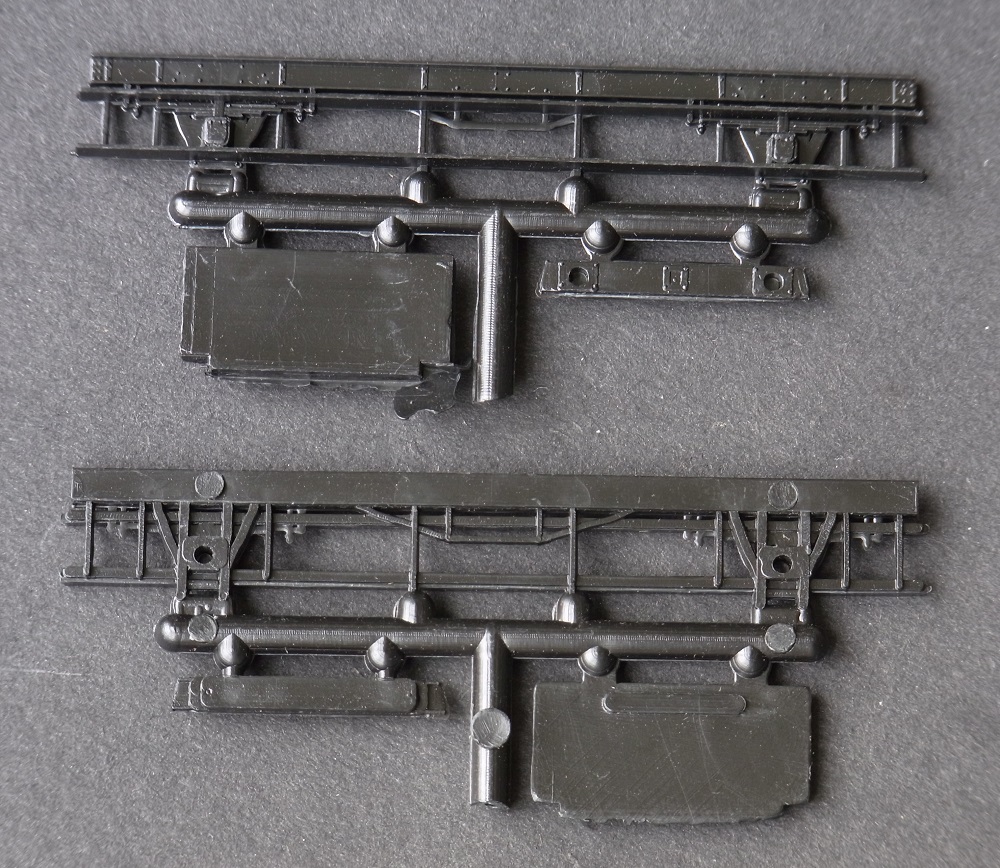 16′ wheel base 24′ BR Brake van under frame with integral Footboards and with headstocks, no buffers, and no brakes. May have the platform concrete ballast weights from the van.