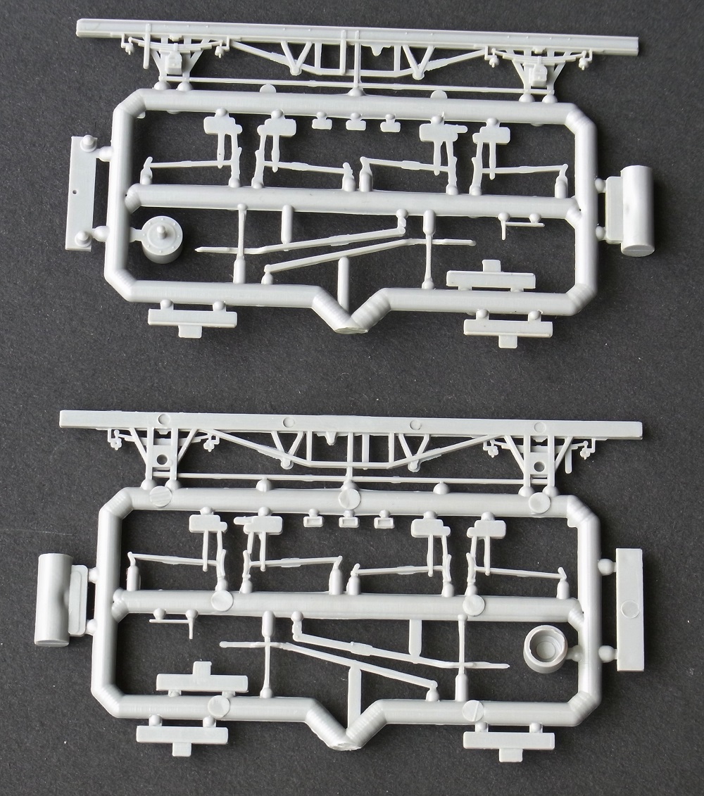 18′ wheel base 27′ 6″ trussed steel underframe for Fruit D, Bloater Fish vans, [and Mink G?]. 4 leaf springs and split axleboxes integral with the W iron, gas tank and vacuum cylinder, long brake levers and 8 brake shoes with push rods, Anita coupling mount.