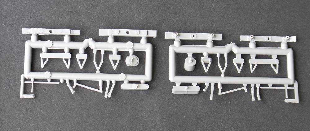 Accessory moulding. 2 sprues each with door bangers, 2 for wood and 2 for steel solebars, 5 mm diameter vacuum cylinder and 3 V hangers, one inside, 1 outside wood, 1 outside steel, pair of asymmetric V hangers and cross shaft, and lifting link for LNER 10′ wheel base vacuum fittings, steel and wooden headstocks with 4 rib long buffers with rounded ends to base, (want steel heads PP014 or PP013) and B&B/DG coupling mount.