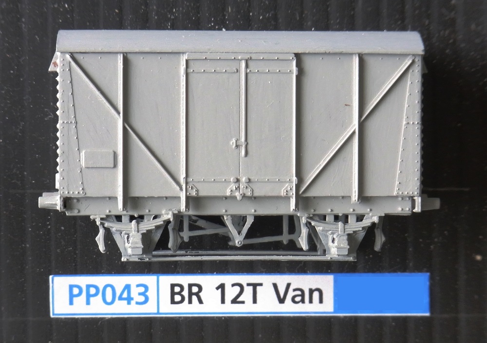 BR 17′ 6″ 12 ton fitted van, diagram 1/213 with PP031 10′ under frame and PP014 buffers. Ply, side hinged doors, corrugated ends with a single ventilator bonnet. The PP031 u/f has the wrong W irons, the PP065 Parkside underframe has the correct ones.