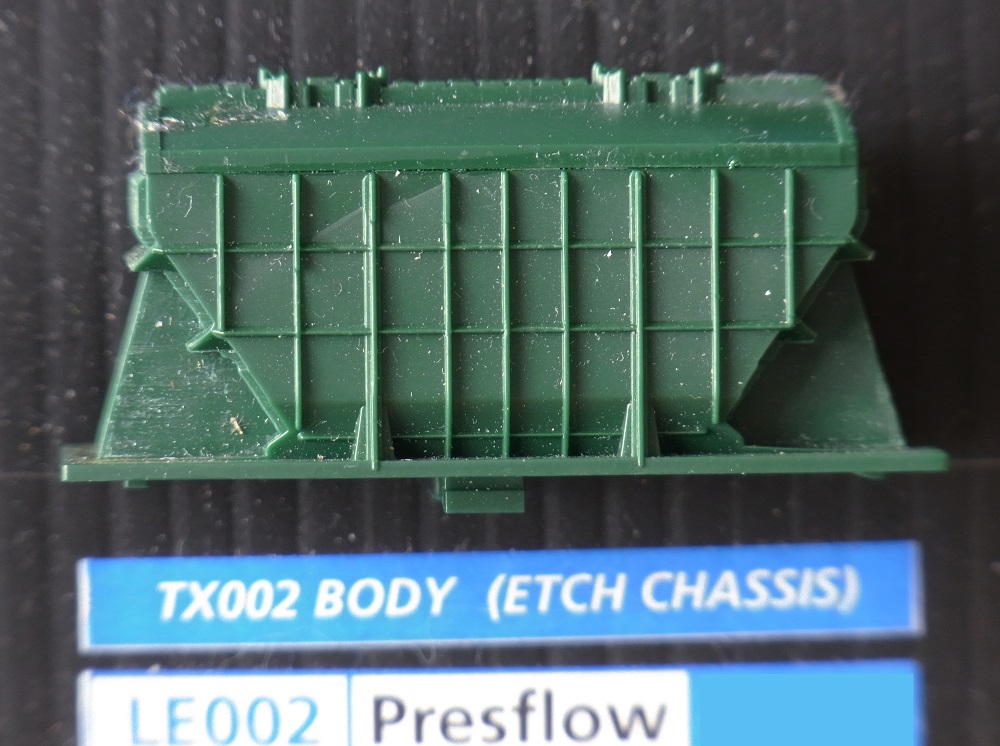 BR 17′ 6″ Presflo covered hopper wagon with Triang Rovex moulding without lettering in red (T278) and AT006 Andrew Thomas etched Nickel Silver 10′ steel under frame, cast roller bearing axlebox & springs, RCH 4 rib buffers [like BR001], pair of vacuum cylinders, bottom discharge valve [not on all Presflos].