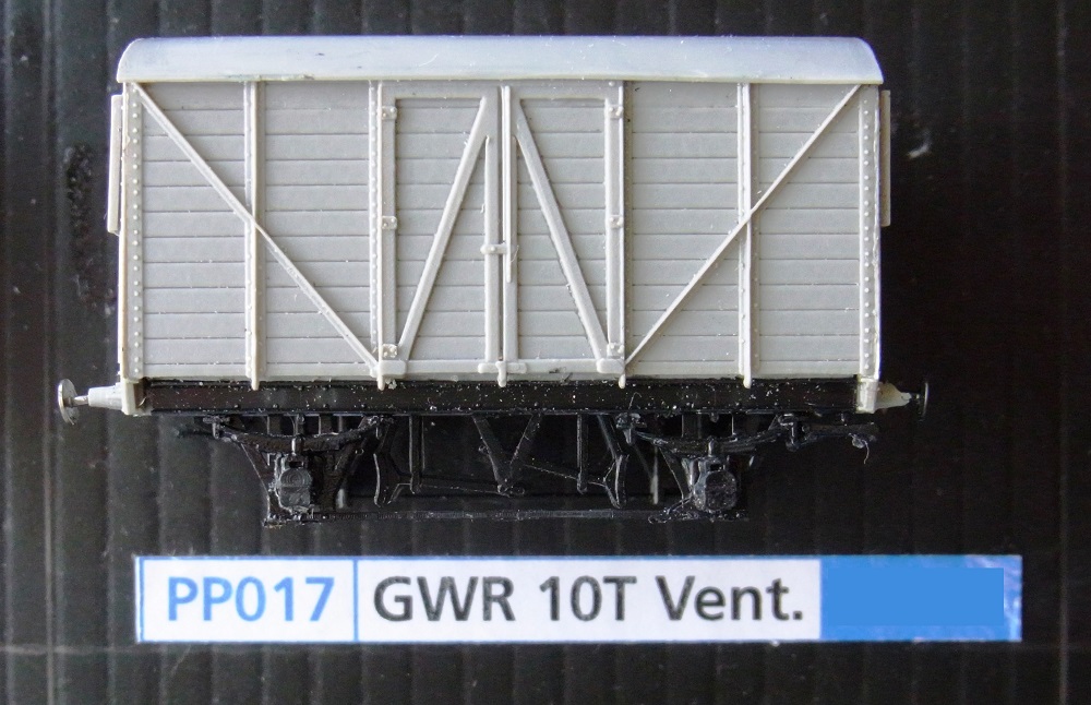 GWR 16′ ventilated van with PP018 (or PP030) 9′ steel under frame and PP014 buffers. Alternative ends can be used to build V12 Mink with shutter ends (open or closed) or V14, V16, or V18 with bonnet ends.