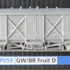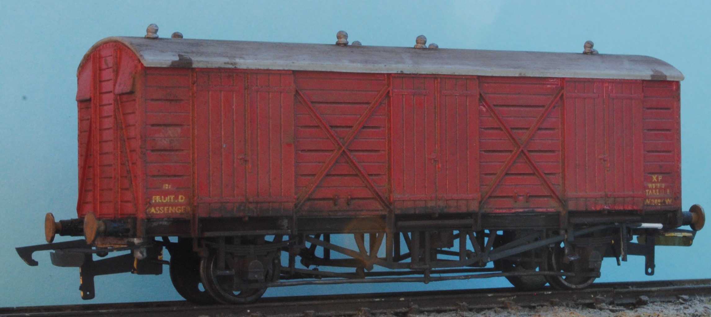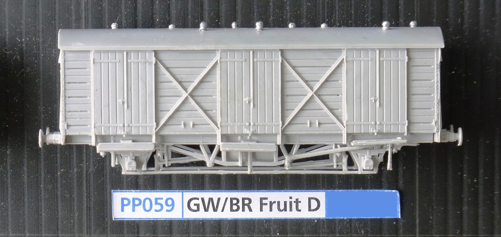 GWR 28′ 6″ Fruit D, diagram Y11 Ventilated Passenger Fruit Van. Y11 were gas lit, the BR NPCS diagram 805 (posthumous GWR diagram Y14) were not. They were coded Passfruit in BR days. Supplied with PP060 18′ under frame and some RH001 Shell vents. The roof (PP061 with floor) is over length to suit a Mink G.