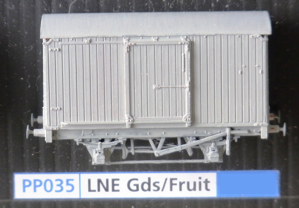 LNER 17′ 6″ goods or fruit van with PP030 9′ under frame and PP014 buffers. The van has sliding doors, vertical planks and alternative ends. The mouldings include the odd bits to do a 9′ LNER vacuum fitted under frame including a 5 mm diameter vacuum cylinder, but the clasp brakes and short brake levers need to come from a 10′ under frame. Diagram 14 is wood and unfitted, diagram 15 is steel and unfitted, diagram 16 is wood and vacuum fitted with the external shutter over the peep hole on some, diagram 17 is steel and vacuum fitted. The alternative slatted end allows a diagram 88 fruit van (which needs 6 torpedo vents) on a 9′ fitted wooden under frame.